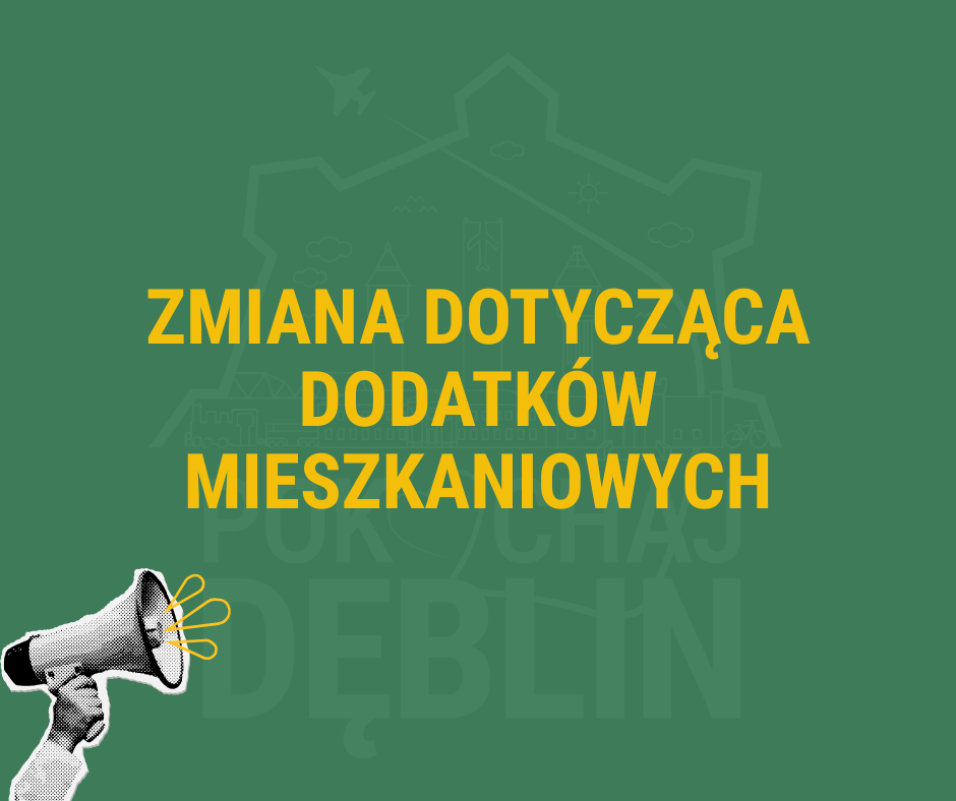 Miasto Dęblin informuje, że zgodnie z Zarządzeniem nr 49.2026 Burmistrza Miasta Dęblin z dnia 16 marca 2026 roku, od dnia 1 kwietnia 2026 r. realizacja spraw związanych z dodatkiem mieszkaniowym została przekazana do Ośrodka Pomocy Społecznej w Dęblinie.
