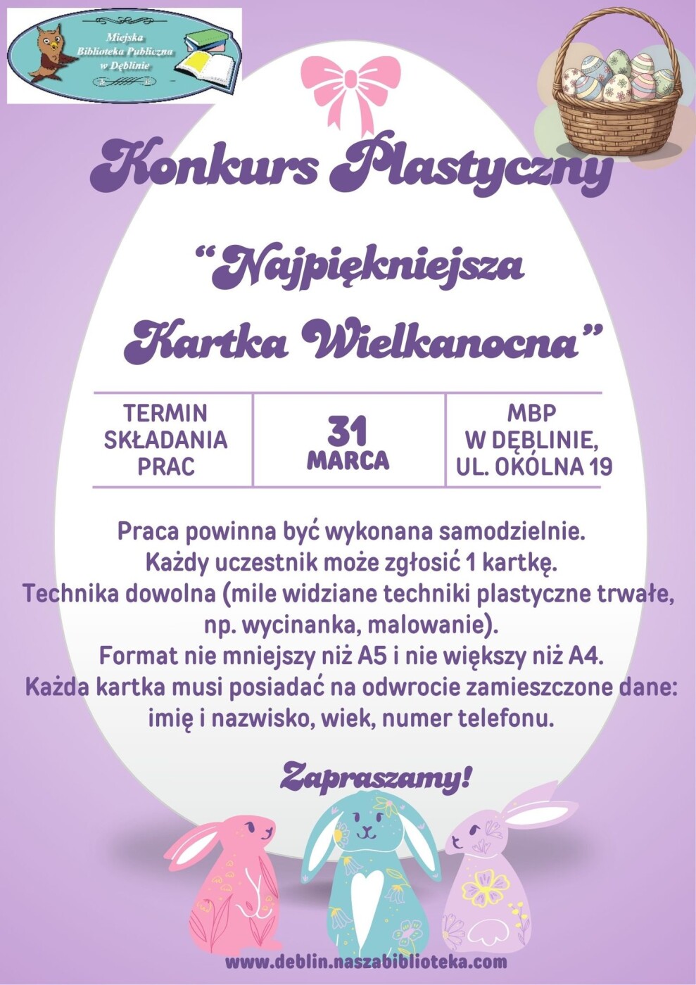 Miejska Biblioteka Publiczna w Dęblinie zaprasza najmłodszych mieszkańców do udziału w konkursie plastycznym „Najpiękniejsza Kartka Wielkanocna” 🐣🌸