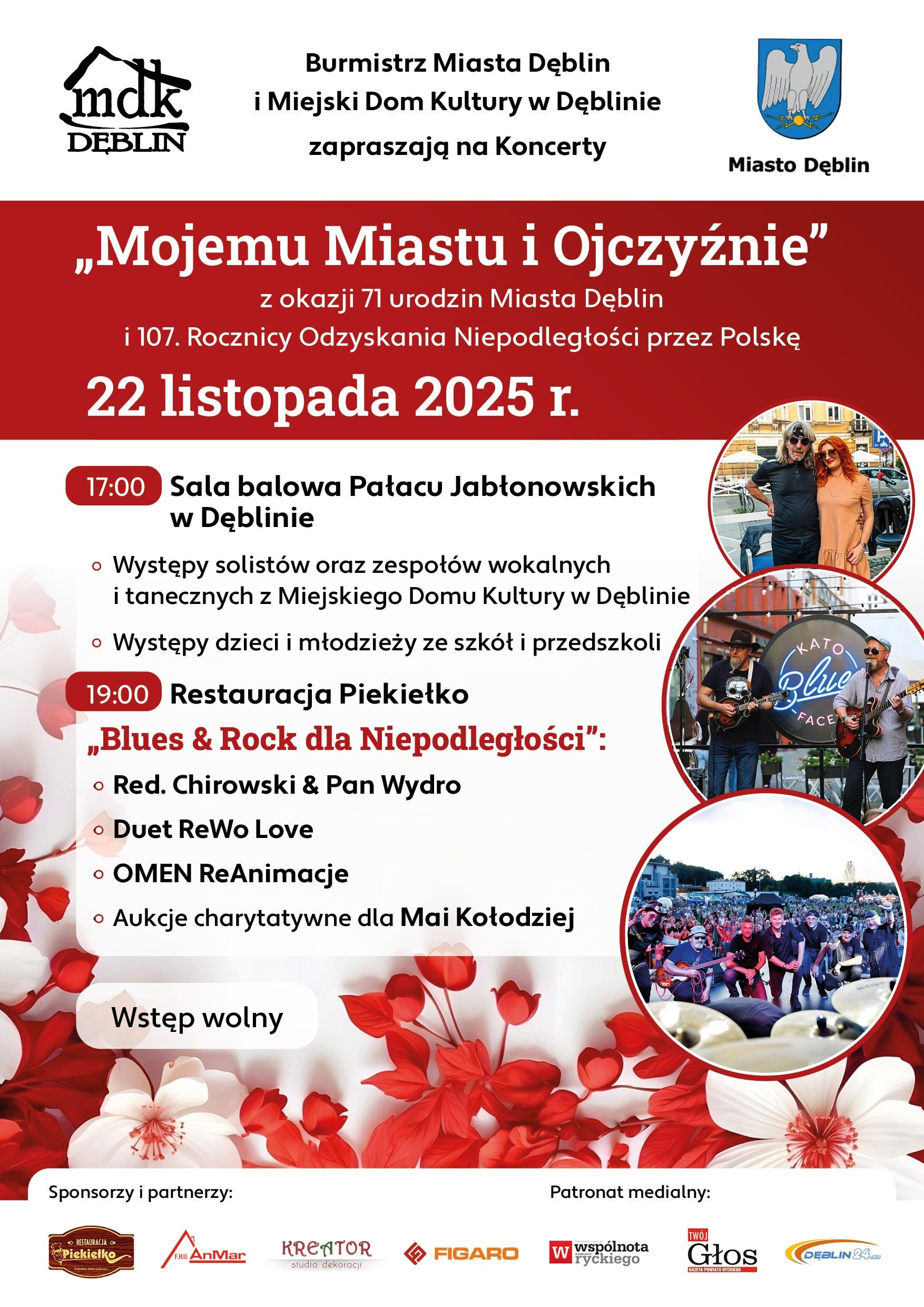 i Miejski Dom Kultury w Dęblinie zapraszają na Koncerty "Mojemu Miastu i Ojczyźnie" z okazji 71 urodzin Miasta Dęblin i 107. Rocznicy Odzyskania Niepodległości przez Polskę - 22 listopada 2025 r.