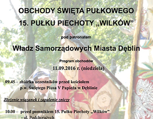OBCHODY ŚWIĘTA PUŁKOWEGO 15. PUŁKU PIECHOTY „WILKÓW” pod patronatem Władz Samorządowych Miasta Dęblin