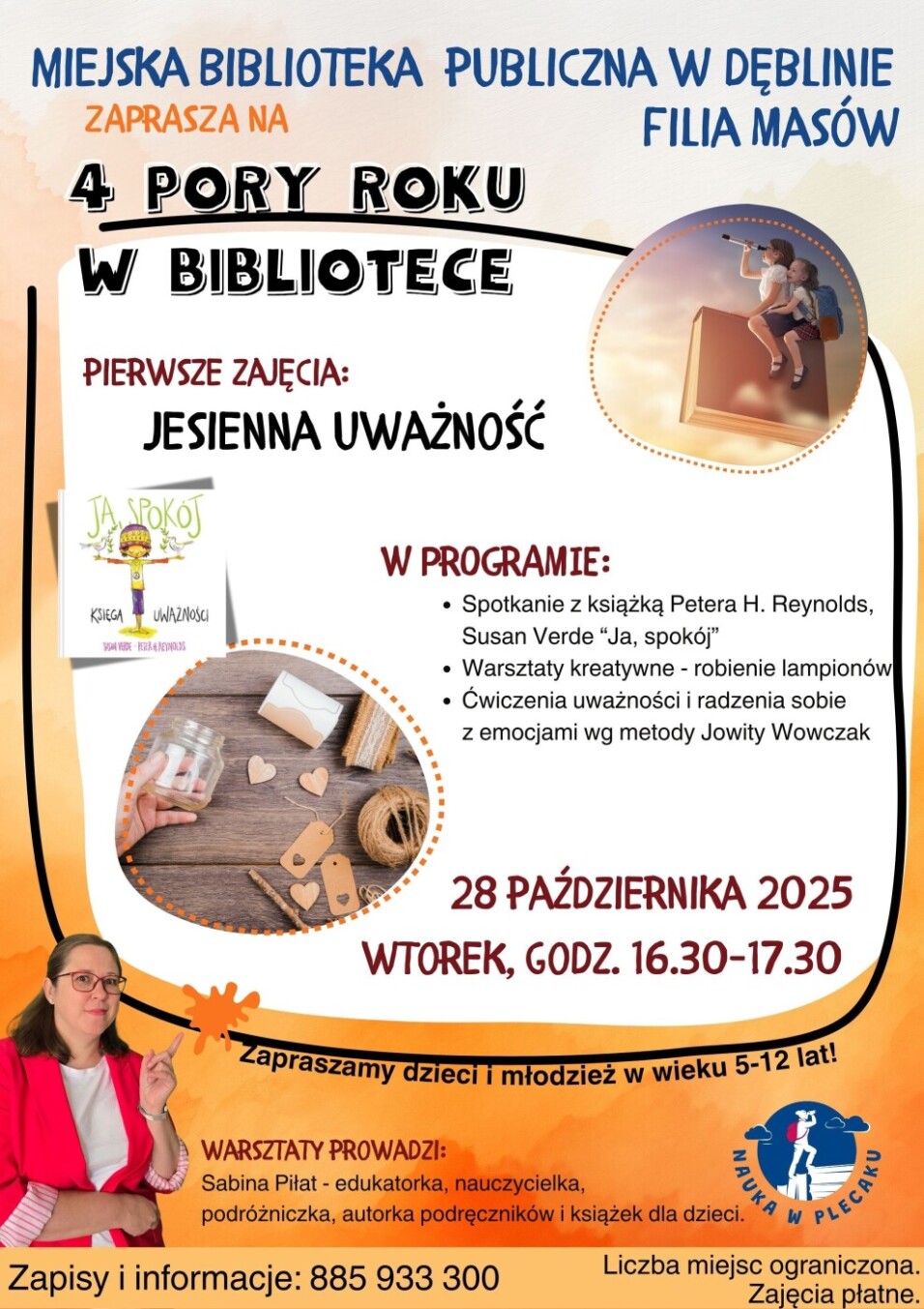 W MBP FILIA Masów już niebawem rusza cykl warsztatów "Cztery Pory Roku w Bibliotece" z nauczycielką, edukatorką i autorką podręczników i książek dla dzieci - Panią Sabiną Piłat.