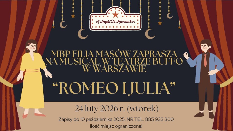 MBP Filia Masów zaprasza Czytelników i nie tylko na wspaniałe widowisko - wspólny wyjazd do Teatru Buffo w Warszawie na musical "Romeo i Julia 3D'. Spektakl jest przeznaczony na widzów w wieku 14+. Czas trwania ok. 100 min. Szczegóły i zapisy w MBP Filia Masów lub pod nr tel. 885 933 300