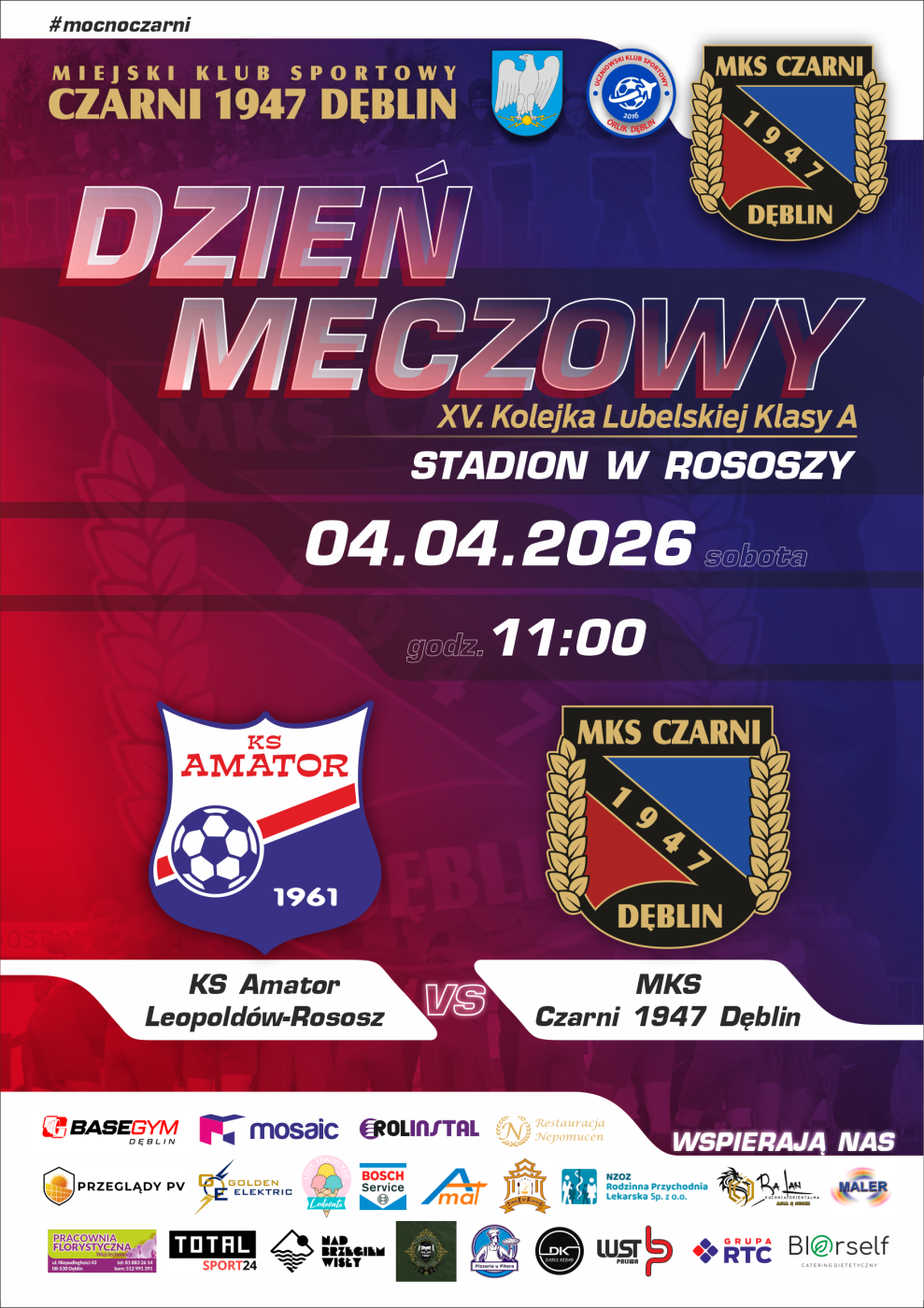 Serdecznie zapraszamy wszystkich mieszkańców oraz kibiców piłki nożnej na kolejne spotkanie ligowe MKS Czarni 1947 Dęblin w ramach XV kolejki Lubelskiej Klasy A.