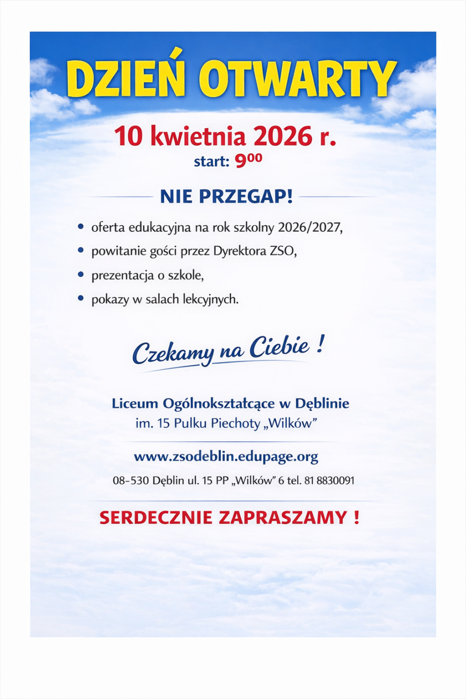 Serdecznie zapraszamy uczniów, rodziców oraz wszystkich zainteresowanych na Dzień Otwarty w Liceum Ogólnokształcącym w Dęblinie im. 15 Pułku Piechoty „Wilków”.